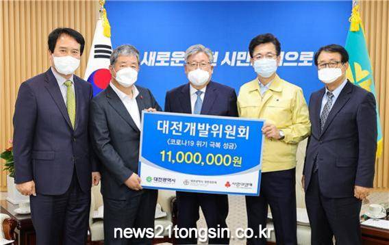 (사)대전광역시 개발위원회(회장 강도묵, 이하 대전개발위원회)가 23일 코로나19로 인해 어려움을 겪고 있는 취약계층을 돕는데 써달라며 성금 1,100만원을 대전시에 기탁했다.