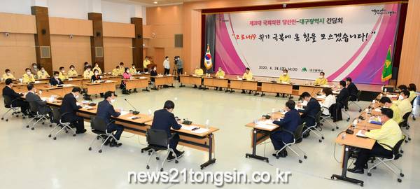 (대구=뉴스21통신) 유재원기자 = 대구시는 24일 오후 2시 대구시청 별관 대강당에서 제21대 국회의원 당선자가 한자리에 모인 가운데 코로나19 방역 추진상황과 시정 주요현안을 공유하는 간담회를 가졌다.