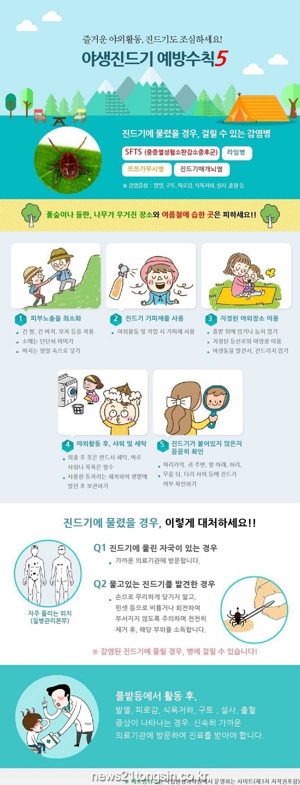 특히, SFTS는 50대 이상의 고령자에서 발생 비율이 높고 야외활동이 시작되는 4월부터 환자 발생이 증가하므로, 야외활동 후 2주 이내에 고열(38-40℃), 소화기증상(오심, 구토, 설사 등)이 있을 경우 즉시 의료기관을 방문해 진료를 받아야 한다.