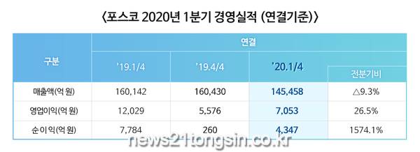 포스코는 지난24일 콘퍼런스콜로 진행된 기업설명회에서 1분기 연결기준 매출 14조 5,458억 원, 영업이익 7,053억 원, 순이익 4,347억 원을 기록했다고 밝혔다.
