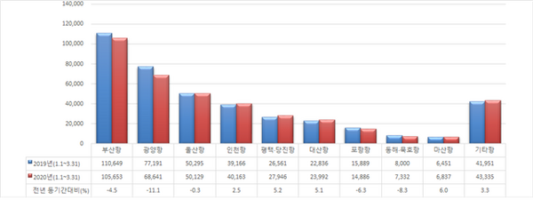 해양수산부(장관 문성혁)는 2020년 1/4분기 전국 무역항에서 처리한 항만 물동량은 총 3억 8,892만 톤으로 전년 동기(3억9,899만톤) 대비 2.5% 감소하였다고 밝혔다.