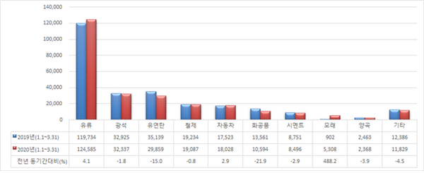 품목별로 보면 유류는 전년 동기 대비 4.1% 증가했으나, 유연탄과 광석은 각각 15.0%, 1.8% 감소하였다.