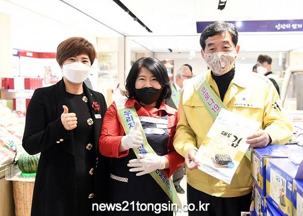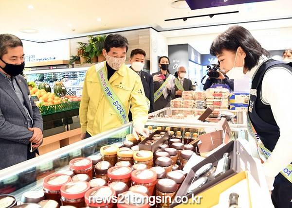 윤화섭 안산시장이 지난 28일 롯데백화점 안산점에서 열린 ‘코로나19 극복! 안산시 농가 살리기’ 농특산물 특별판매 행사장을 방문해 생산농가들을 격려하고 농민들의 애로사항을 청취했다.