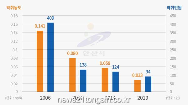 같은 기간 반월국가산업단지(안산스마트허브) 인근에서 측정된 주요 악취유발 물질인 황화수소 농도는 2006년 0.141ppb에서 2019년 0.033ppb로 76.6% 줄어들었다.