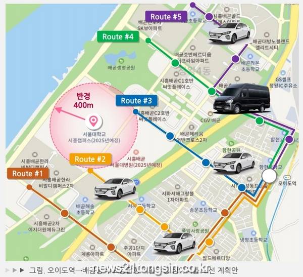 이는 자율주행 심야 셔틀 서비스 사업으로, 4호선 오이도역에서 서울대학교 시흥캠퍼스 주변 배곧 일대를 잇는 자율주행자동차 시범운행지구에서 총 5개 노선에 8대의 자율주행자동차가 운행될 예정이다.