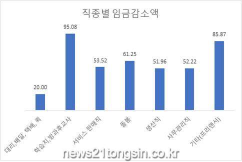 또한, 임금 감소액은 학습지 방과후 강사 등이 95만 원, 프리랜서 85만 원, 돌봄 직종 61만 원, 서비스 판매직 53만 원, 사무직 52만 원, 생산직 51만 원, 대리 등이 20만으로 줄었다고 답했다.