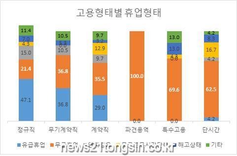 휴업 비중에서 정규직은 21.4%, 파견용역 100%, 특수고용 69.6%, 단시간 62.5%로 비정규직, 특수고용에서 무급휴업이 압도적인 비중을 차지한 것으로 나타났고 무기계약직 36.8%, 계약직 35.5%가 뒤를 이었다.
