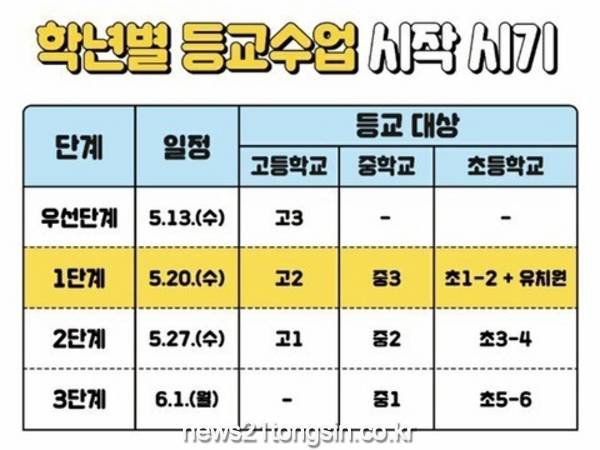 (대구=뉴스21통신) 유재원기자 = 교육부가 발표한 각급 학교의 등교 수업 일정에 맞춰 대구시교육청은 생활 속 거리두기로의 전환과 연계해 5월 13일(수) 고등학교 3학년부터 순차적으로 등교 수업을 시작한다.