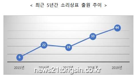 특허청(청장 박원주)은 방송광고 등에 사용하는 음계 및 리듬감, 유행어 등을 지식재산권으로 보호받을 수 있는 소리상표 출원 건수가 ‘15년 6건에서 ’19년 44건으로 약 7.3배 증가했다고 밝혔다.