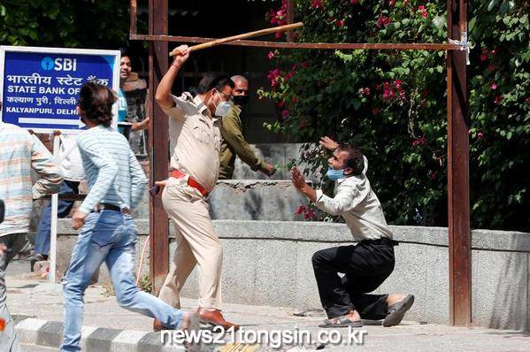 사진은 인도 뉴 델리에서 코로나19 확산을 늦추기 위한 전국적으로 확장 된 폐쇄 기간 동안 밖에서 사회적 거리 규칙을 어긴 사람에게 경찰이 지휘봉을 휘드르고 있다.