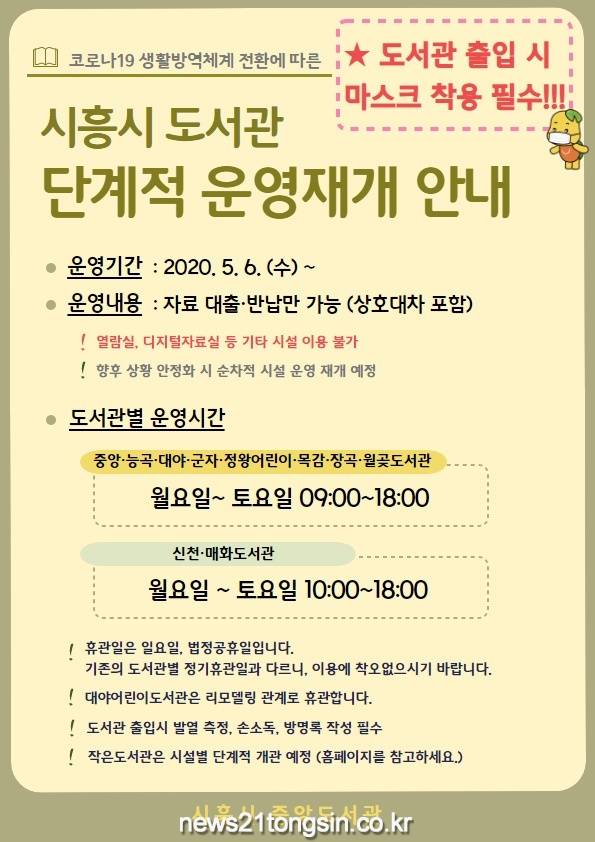 시흥시중앙도서관(관장 김경남)은 5월 6일부터 코로나19 확산 방지를 위해 임시휴관 중이었던 공공도서관 문을 열고 자료 대출․반납 서비스를 재개했다.