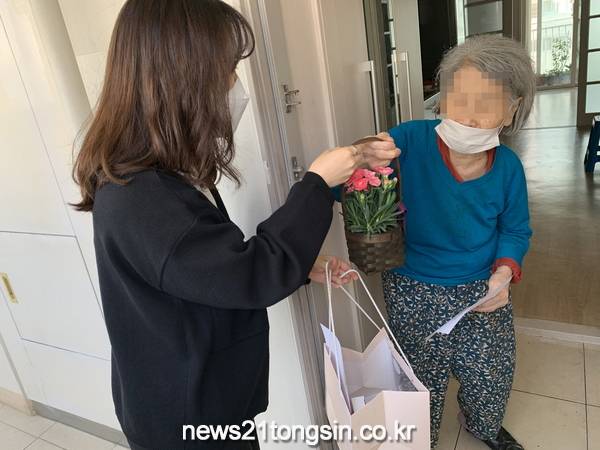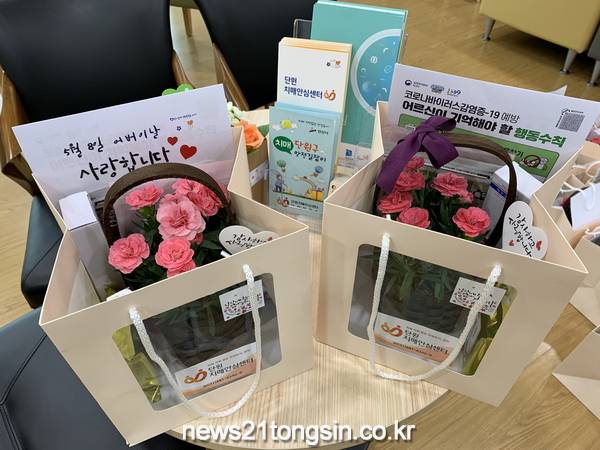 어버이날을 맞아 특별히 마련된 카네이션 바구니와 함께 전날부터 전달된 치매 건강꾸러미는 코로나19와 황사 예방에 도움이 되는 면 마스크, 물티슈 등 개인위생 물품으로 구성됐다.