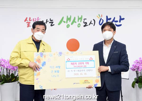 안산시(시장 윤화섭)는 8일 ㈜가연으로부터 관내 복지사각지대 이웃의 코로나바이러스감염증-19(코로나19) 감염 예방을 위해 사용해 달라며 비접촉 체온계 100개(1천500만원 상당)를 기탁 받았다.