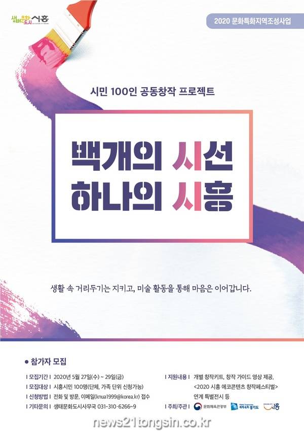 한편, 2020년 시민 100인 공동창작 프로젝트 ‘백 개의 시선, 하나의 시흥’은 시흥시민(단체, 가족단위 신청 가능)이라면 누구나 신청할 수 있으며, 신청기간은 5월 27일부터 29일까지 전화 및 방문, 이메일 접수로 선착순 100명을 모집한다. 모집신청과 관련된 자세한 내용은 시흥시청 홈페이지나 생태문화도시 시흥 블로그 공지사항에서 확인할 수 있다.
