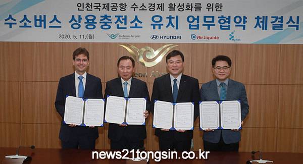 현대자동차는 지난 11일(월) 인천광역시 중구에 위치한 인천국제공항공사에서 구본환 인천국제공항공사 사장, 기욤 코테(Guillaume Cottet) 에어리퀴드코리아 대표이사 사장, 유종수 수소에너지네트워크 대표, 한성권 현대자동차 상용사업담당 사장 등 사업 관계자가 모인 가운데 인천국제공항 수소전기버스 충전소 유치를 위한 업무협약을 체결했다.
