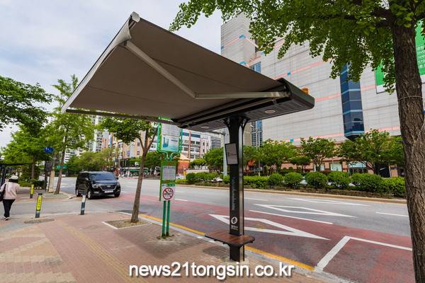 광진구(구청장 김선갑)가 다가오는 여름철 폭염에 대비하고 마을버스를 이용하는 구민들의 편의를 위해 전국 최초로 마을버스 정류소에 ‘광진형 마을버스 IoT 그늘 쉼터’를 시범 설치하고 운영에 들어갔다.