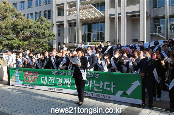 대전사랑운동센터는 12일 오후 5시 대전시청 북문광장에서 소상공인 등 50여명이 참여한 가운데 코로나19 아웃(OUT), 착한 소비촉진 범시민 운동 발대식을 개최했다.