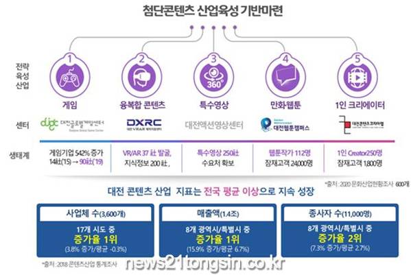 최근 한국콘텐츠진흥원 콘텐츠산업 통계조사 결과 대전 콘텐츠 산업 지표는 전년도 대비 사업체 수 증가율 전국 1위, 매출액 증가율 특·광역시 1위, 종사자 수 증가율 특·광역시 2위로 전국 평균 이상으로 지속 성장하고 있다.