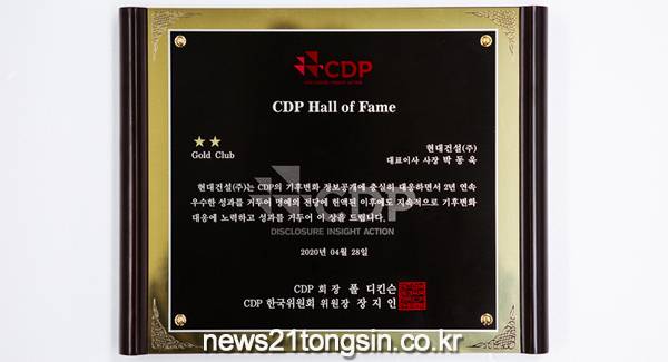 현대건설은 글로벌 환경경영 인증기관인 ‘탄소정보공개 프로젝트(Carbon Disclosure Project, CDP)’ 한국위원회가 발표한 ‘CDP Korea 명예의 전당’에 2년 연속 입성하는 쾌거를 이뤘다.