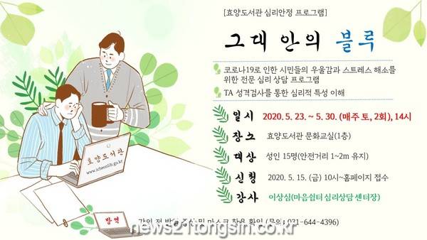 이천시립효양도서관은 코로나19로 인한 우울감과 스트레스로 힘겨워하는 시민들을 위해 전문적 심리안정프로그램인 “그대안의 블루”를 5월 23일, 30일 매주 토요일 오후 2시에 운영한다.