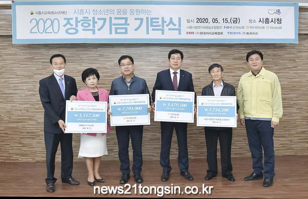 시흥시교육청소년재단(이사장 강경희 ㈜광진화학 대표/명예이사장 임병택 시흥시장. 이하 재단)과 북시흥농협 등 6개 기관이 15일 시흥시청 글로벌센터에서 관내 청소년을 위한 장학기금 기탁식을 진행했다.