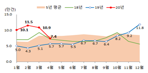 지역별로살펴보면 수도권(116,895건)은 전월 대비 14.6% 감소, 전년동월 대비 7.6% 증가, 지방(53,321건)은 전월 대비 15.2% 감소, 전년동월 대비 0.4% 증가하였다.