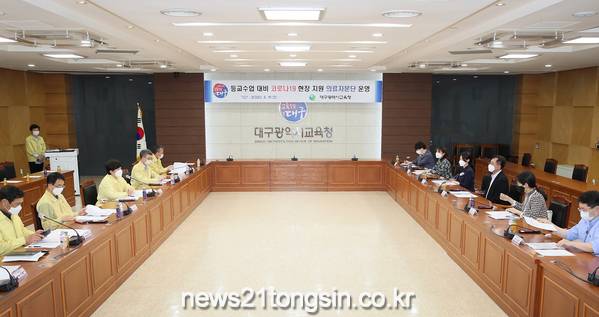 (대구=뉴스21통신) 유재원기자 = 대구시교육청은 5월 19일(화) 오후 5시 시교육청 여민실(동관 3층)에서 오는 20일 고3 학생을 시작으로 등교수업이 순차적으로 시작됨에 따라, 학생 등교 이후 학교 내 코로나19 확진자 발생 시 신속 대응하고 다양한 상황 변화에 대비하기 위해 소아청소년과, 감염내과, 예방의학과, 정신건강의학과 전문의로 구성된 ‘의료자문단’을 구성하고 발대식을 가졌다.