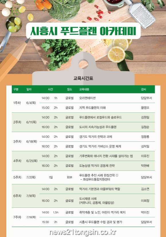 교육은 오는 6월 4일부터 7월 16일까지 총 7회(매주 목) 과정이며 수강료는 무료이다.▲지역 푸드플랜의 이해 ▲먹거리 전략과 과제 ▲푸드플랜 선진사례 현장 견학 교육 등으로 구성 될 계획이다.