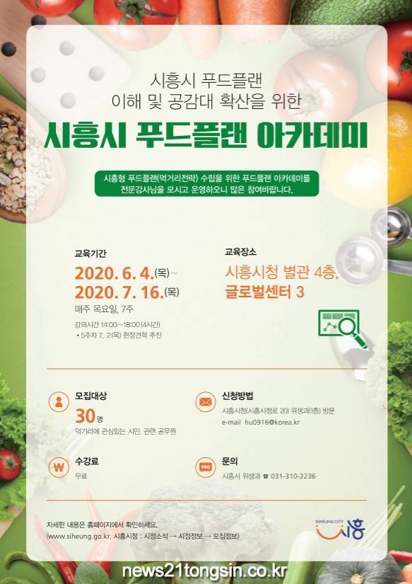 시흥시(시장 임병택)는 시민이 체감할 수 있는 안정적인 지역푸드 플랜을 수립하고, 성공적으로 정책을 추진하기 위한 ‘시흥시 푸드플랜 아카데미’ 교육생을 모집한다.