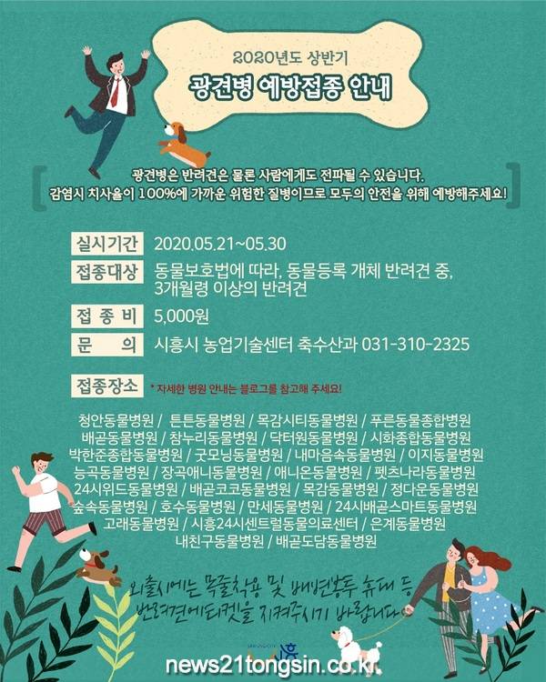 시흥시(시장 임병택)는 2020년 봄을 맞아 21일부터 오는 30일까지 관내 동물병원 26개소에서 광견병 예방접종을 실시한다.