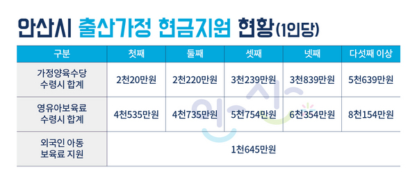 경기지역 최고 수준인 안산시 지원책을 살펴보면, 출생축하금과 10만원 상당의 출생축하용품 지급, 산후조리비 50만 원 지원 등을 시작으로, 아동수당이 83개월 동안 10만원씩 기본으로 지급된다. 출생축하금은 첫째 아이 100만 원, 둘째 이상 300만 원이 지급된다.