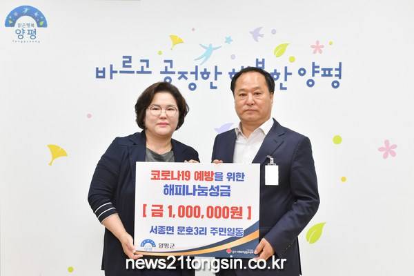 지난 22일 서종면 문호3리(이장 김숙영) 주민일동들이 코로나19 극복을 위해 십시일반으로 성금을 모아 양평군에 100만원을 기탁하였다.