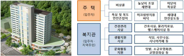 고령자복지주택은 정부의 주거복지로드맵 중 고령자 주거복지 강화를 위해 어르신들의 생활에 불편함이 없도록 설계한 주택과 사회복지시설이 복합 설치된 영구임대주택으로 주거와 돌봄을 한 번에 받을 수 있는 고령자 맞춤형 주택이다.