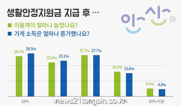 설문에 참여한 가맹점주 전원은 생활안정지원금 지급 후 이용자와 가게 매출이 모두 10% 이상 증가했다고 답했다. 이용객과 매출이 30% 이상 증가했다고 응답한 가맹점주는 각각 50.4%, 48.3%에 달해 절반에 가까운 것으로 나타났다.