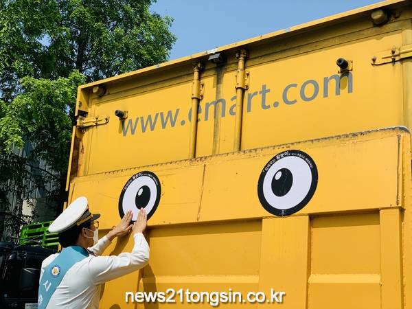 시흥경찰서가 이마트 시화물류센터와 함께 화물차 사고 예방을 위한 ‘왕눈이 스티커 부착 캠페인’을 펼쳤다고 26일 밝혔다.