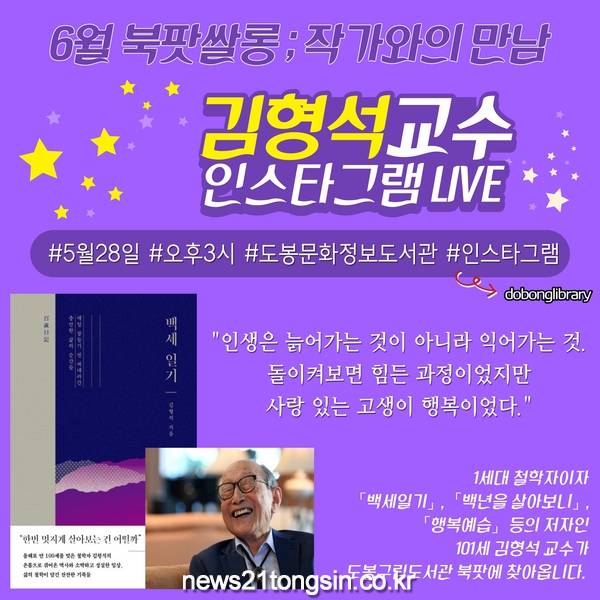 도봉구(구청장 이동진)는 오는 28일(목) 오후 3시부터 약 1시간동안 도봉문화정보도서관 공식 인스타그램을 통해 <백세일기> 김형석 작가와의 만남을 라이브로 방송한다.