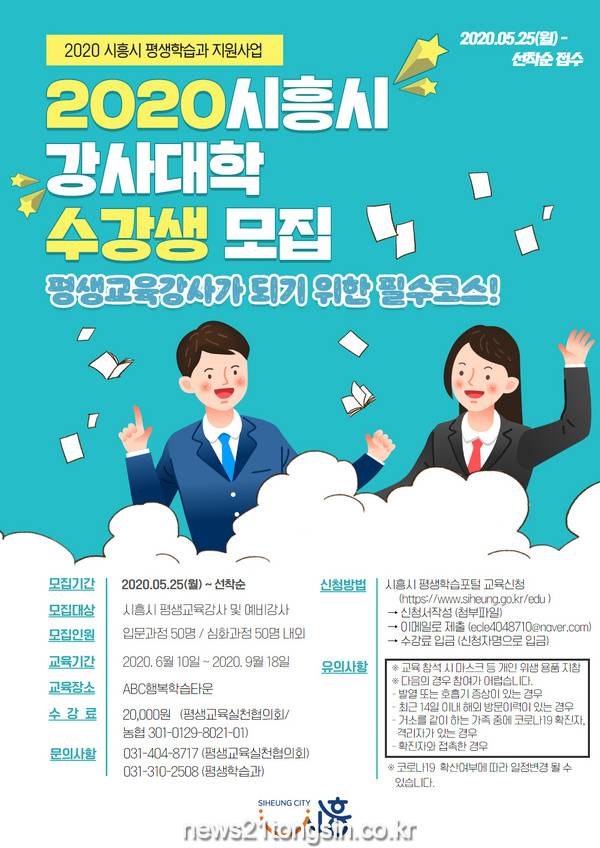 한편 시흥시는 코로나19감염예방 수칙을 준수하여 이번 강사대학을 진행할 계획이며, 수강생은 발열 또는 호흡기증상이 있거나 마스크 미착용 시는 수업참여가 불가하다.