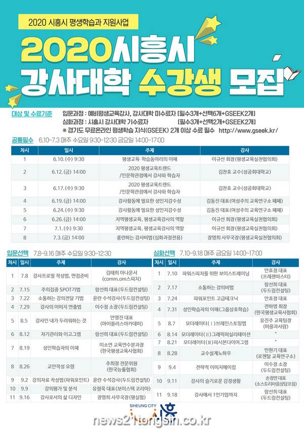 강사대학은 오는 6월 10일에 개강해 9월 18일까지 시흥ABC행복학습타운에서 운영되며, 강사를 준비하는 예비강사나 시흥시 강사대학을 수료한 적이 없는 강사는 입문과정을, 강사대학 기수료자는 심화과정을 신청하면 된다.
