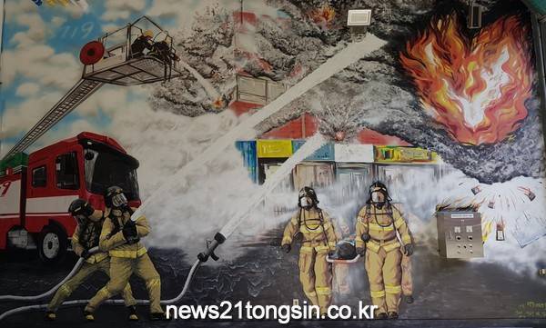 이번에 제작된 트릭아트는 샘머리119안전센터 1층 차고 벽면을 이용해 건물화재 현장에서 인명 구조와 화재 진압 작전을 펼치는 믿음직스런 소방관을 형상화했다.