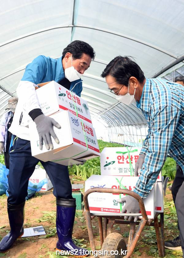 이달 15일 정부서울청사에서 기획전을 위해 열렸던 업무협약식에 참석한 윤화섭 안산시장은 지난 28일 안산팜 영농조합법인을 방문, 직접 열무와 방울토마토 등 농작물 수확과 포장을 돕는 등 일손을 보탰다.
