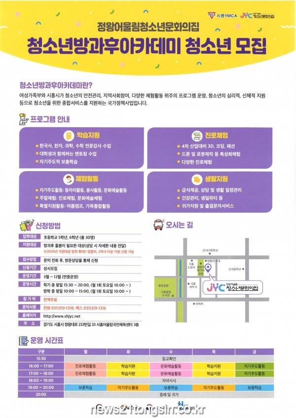 시흥시 ‘청소년 방과 후 아카데미’는 청소년을 위한 학습지원, 안전관리, 지역사회 참여, 다양한 체험활동 위주의 프로그램을 운영하고 청소년의 심리적, 신체적 지원 등 청소년을 위한 종합서비스를 제공하는 사업이며, 참가비는 전액 무료이다.