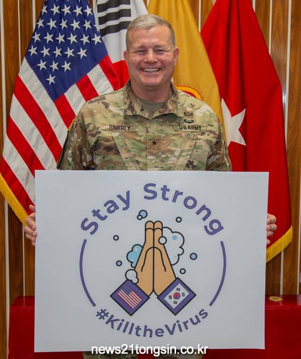(대구=뉴스21통신) 유재원기자 = 지난 1일 주한미군 제19지원사령부 사령관 마크 시멀리 (Mark T. Simerly)준장은 코로나19 바이러스를 극복하기 위한 ‘스테이 스트롱’ 캠페인에 동참하였다.
