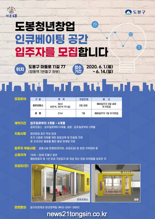 도봉구(구청장 이동진)는 유망한 창업 아이템을 가진 청년인재를 발굴하고 지원하기 위해 청년창업 인큐베이팅 공간(창동스타트랩) 입주자를 6월 14일까지 모집한다.