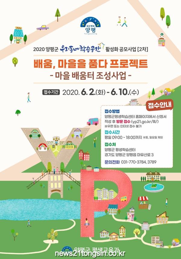 양평군(군수 정동균)은 평생학습의 지역사회 환원 활동으로 저변확대를 도모하는 『배움 마을을 품다 프로젝트 ‘마을 배움터 조성사업’』 을 추진할 사업 대상자를 추가 모집한다고 밝혔다.