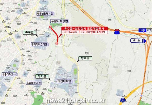 대전시에 따르면 총길이 0.54㎞, 왕복 4차로 규모의 용수골~남간정사 도로개설은 총사업비 313억 원을 투자해 2024년 개통을 목표로 추진하는 사업이다.