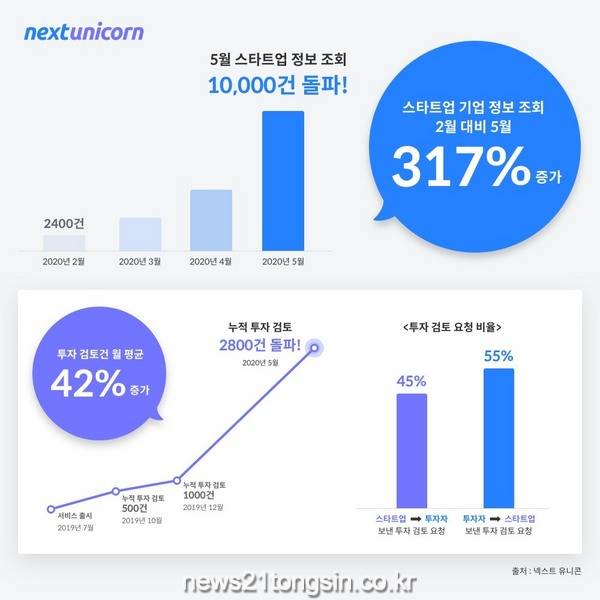 하프스는 넥스트 유니콘 서비스 통한 스타트업 기업 정보 조회가 5월 기준 1만건으로 2월 대비 317% 증가했다고 밝혔다. 또한 기업 정보 확인 후 사업계획서 및 자료를 전달하고 검토하는 횟수가 누적 2800건을 돌파하며 2월 대비 3배, 월평균 42% 증가했다고 밝혔다.