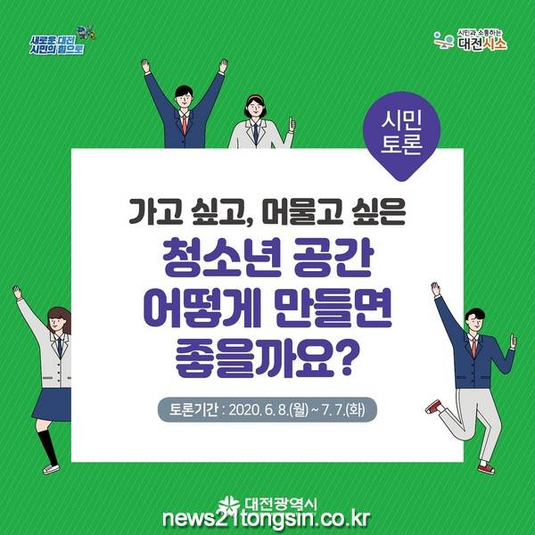 대전시는 8일부터 내달 7일까지 시민참여 플랫폼 대전시소(daejeon.go.kr/seesaw)에서 ‘가고 싶고, 머물고 싶은 청소년 공간 어떻게 만들면 좋을까요?’를 주제로 온라인 공론장을 연다고 밝혔다.