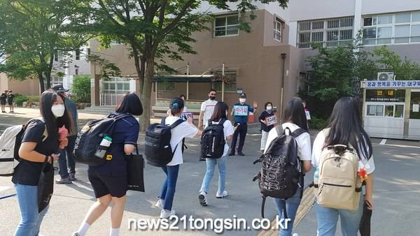 (대구=뉴스21통신) 유재원기자 = 대구북부경찰서는 2020. 6. 8. 08:00경, 대구북중학교에서 학교 전담경찰관(spo)과 서부교육지원청 및 학교 측과 합동으로 등굣길 학생들을 맞이하며「 코로나 예방 안전 활동」을 전개 하였다.