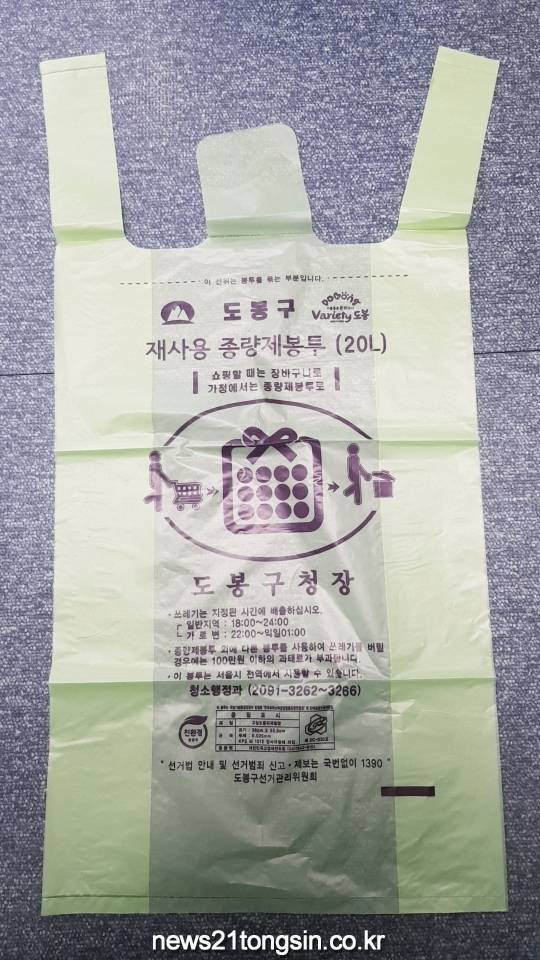 도봉구(구청장 이동진)가 집과 공공기관에서 쓰는 종량제 봉투를 재생원료를 사용한 친환경 종량제봉투로 전면 도입한다. 비닐류의 자원 재활용률을 제고하고 환경보전을 위해서다.