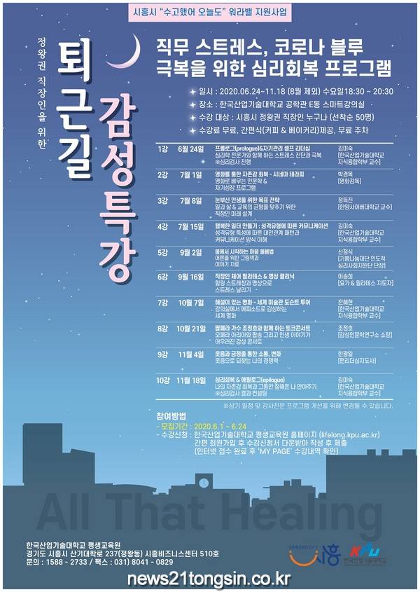 ‘수고했어 오늘도’는 오는 6월 24일에 개강해 11월 18일까지 한국산업기술대학교에서 진행된다. 시흥시 직장인이라면 누구나 신청가능하다.